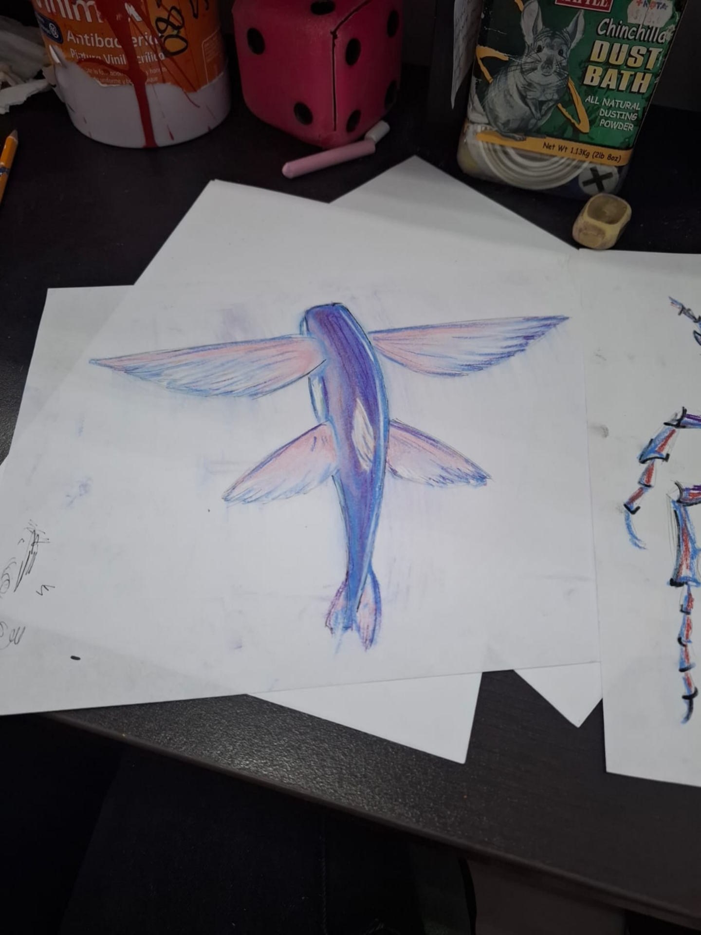 Utilicé una paleta de tonos azules, morados y rosados claros para crear un efecto iridiscente y etéreo en las "alas", contrastando con el cuerpo. La técnica de capas suaves con lápices de color busca simular la textura acuática y enfatizar la simetría y la gran envergadura de las aletas, haciendo que la figura parezca deslizarse sobre el papel.