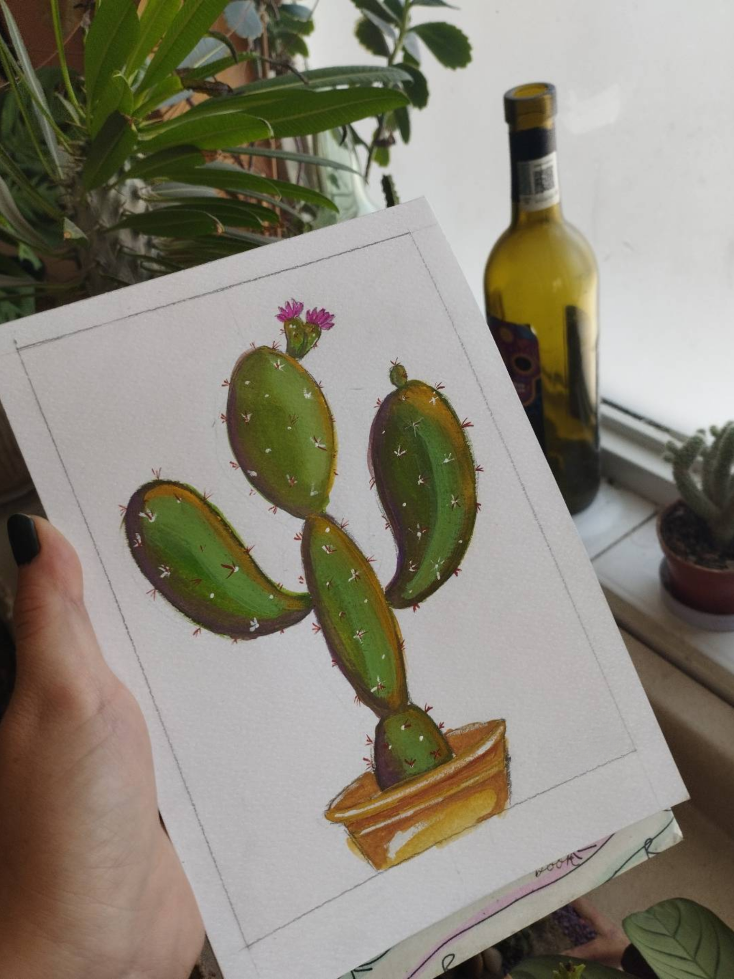Esta pieza es una ilustración a gouache y lápiz de color que retrata un nopal (Opuntia) con una pequeña floración. La intención fue realizar un estudio de luz y forma, destacando la textura carnosa y cerosa de la planta.
