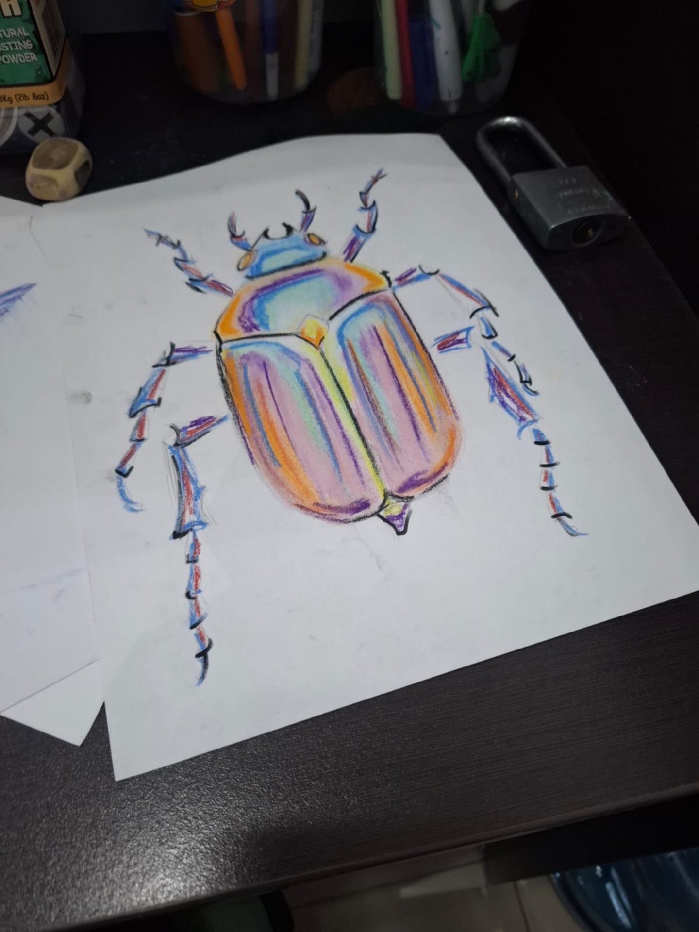 Esta pieza es una ilustración a lápiz de color (y posiblemente pastel o lápiz graso) que retrata un escarabajo (posiblemente un tipo de escarabajo joya o Mayate) con una paleta de colores vibrantes y tornasolados. La intención fue realizar un estudio de color y luz, destacando la iridiscencia del caparazón del insecto.