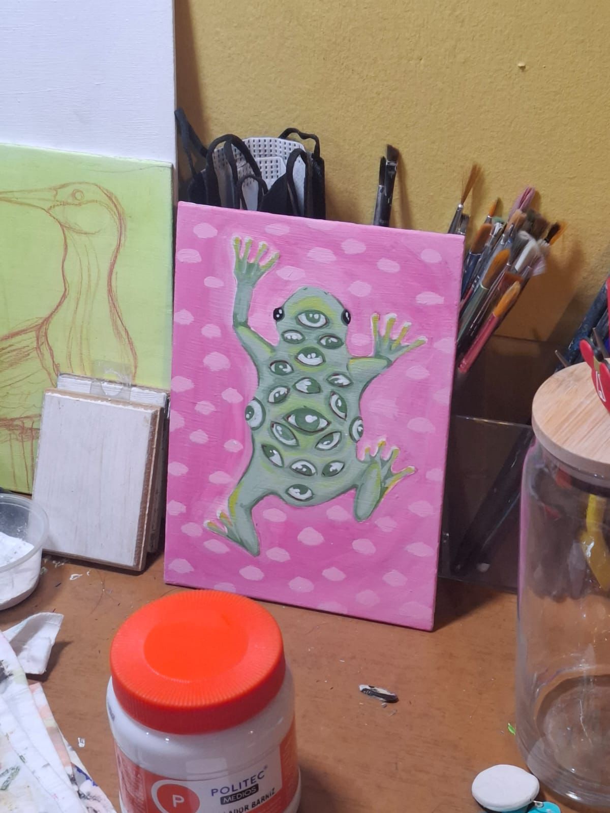 El enfoque técnico se centró en el uso del color y el contraste. Utilicé una base de verdes oscuros y saturados, aplicando toques de blanco y amarillo brillante para simular los reflejos de la luz sobre las paletas del nopal. Este contraste dinámico ayuda a darle volumen y vitalidad a la figura, presentando un toque de realismo estilizado a este icónico elemento de la flora desértica.